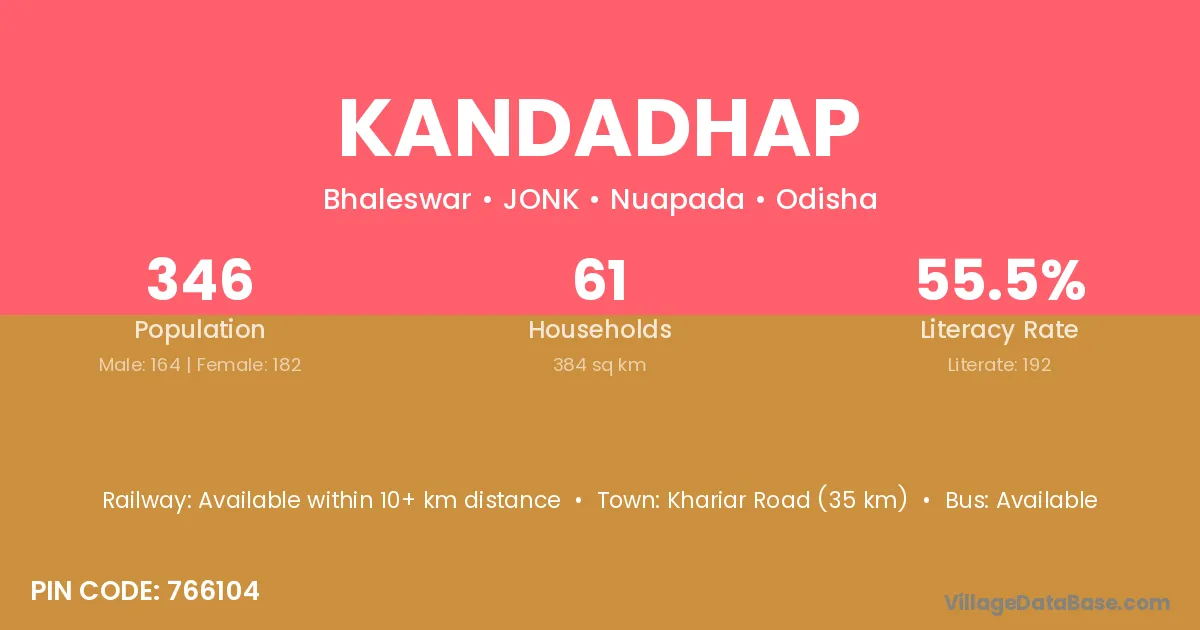 Khariar Road (35 km) is the nearest town to Kandadhap village for major economic activities and is located approximately 35 km away.