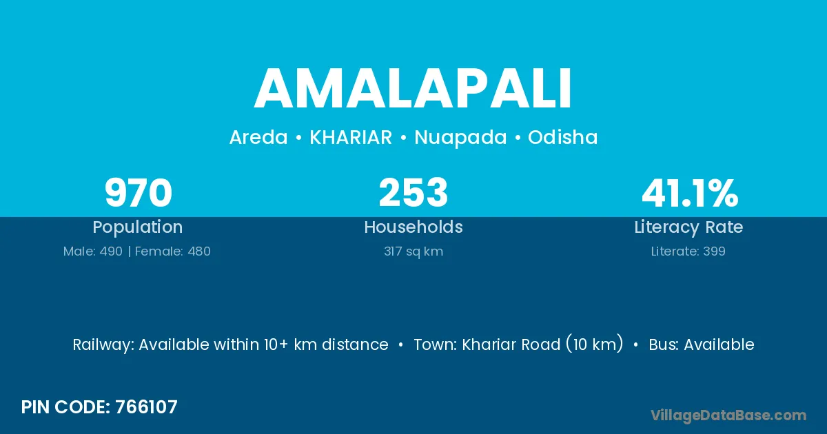 Khariar Road (10 km) is the nearest town to Amalapali village for major economic activities and is located approximately 10 km away.