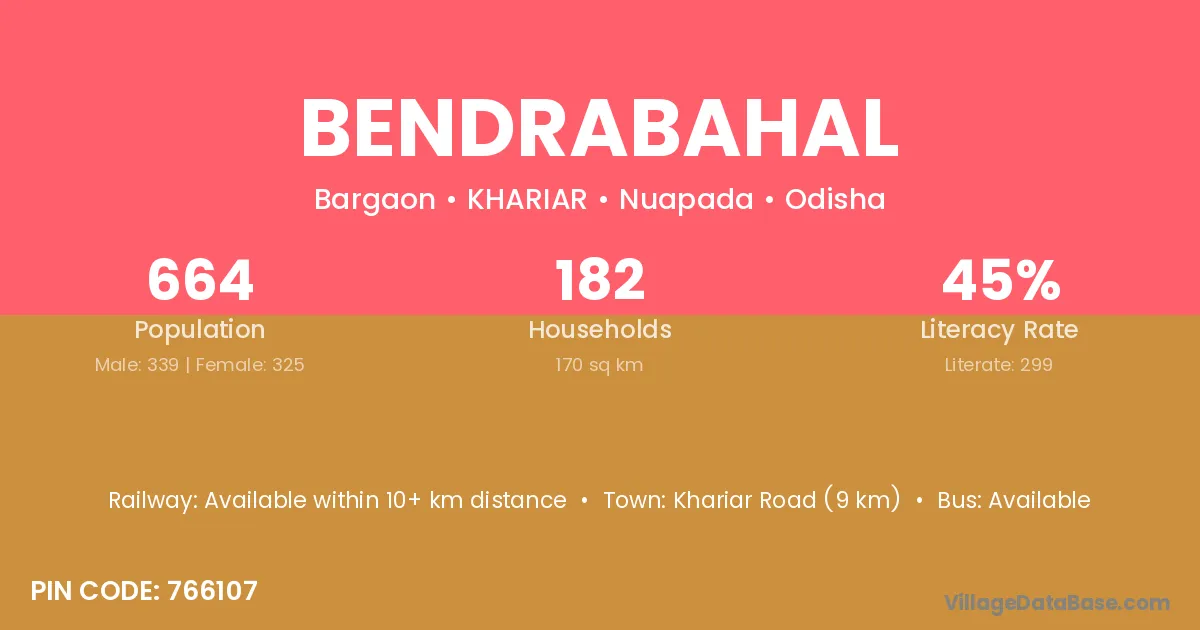 Khariar Road (9 km) is the nearest town to Bendrabahal village for major economic activities and is located approximately 9 km away.