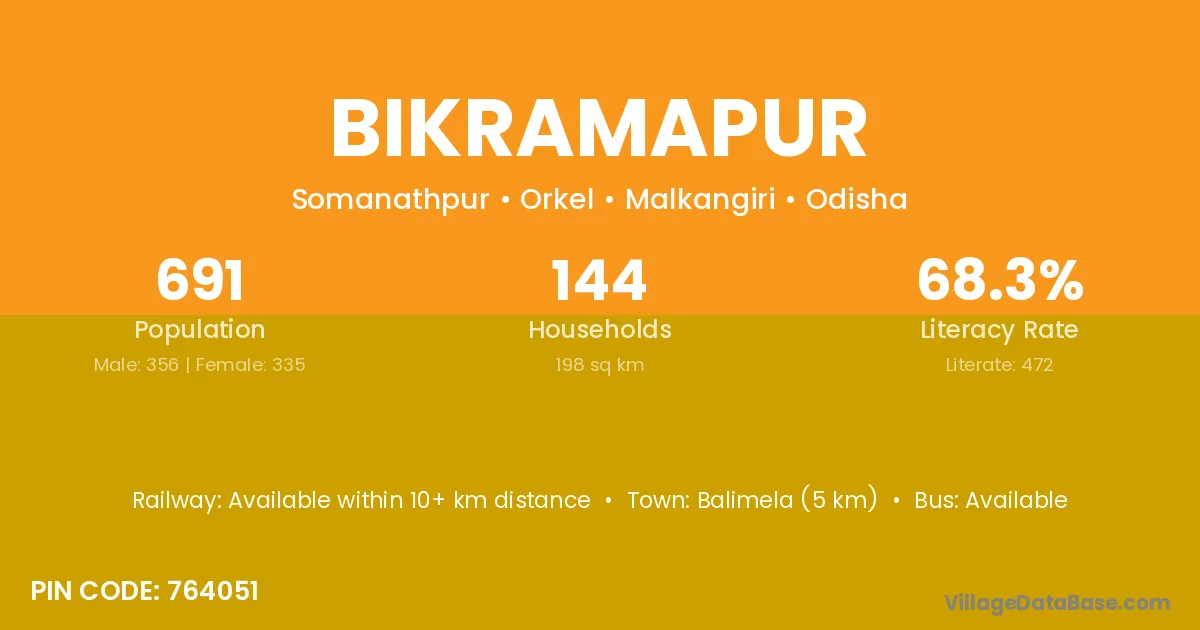 Khariar Road (17 km) is the nearest town to Bikramapur village for major economic activities and is located approximately 17 km away.