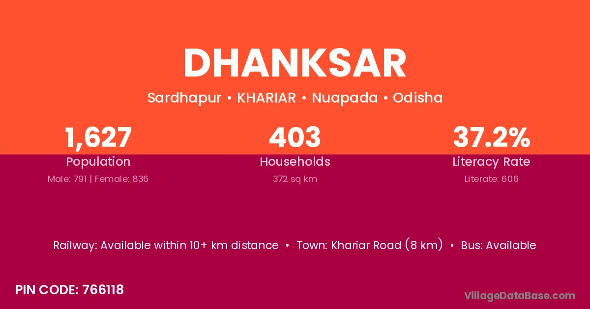 Khariar Road (8 km) is the nearest town to Dhanksar village for major economic activities and is located approximately 8 km away.