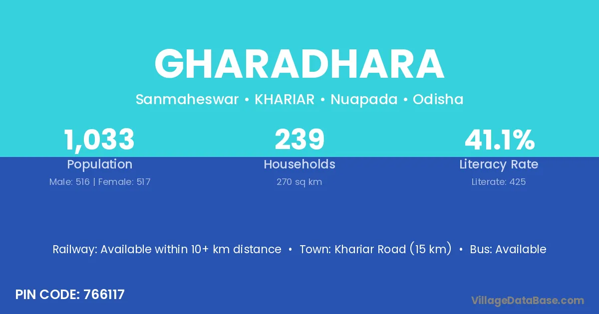 Khariar Road (15 km) is the nearest town to Gharadhara village for major economic activities and is located approximately 15 km away.