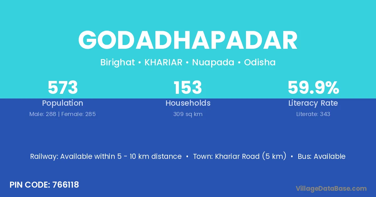 Khariar Road (5 km) is the nearest town to Godadhapadar village for major economic activities and is located approximately 5 km away.