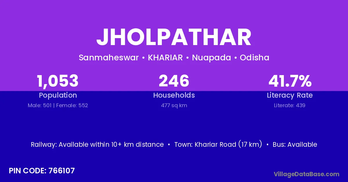 Khariar Road (17 km) is the nearest town to Jholpathar village for major economic activities and is located approximately 17 km away.