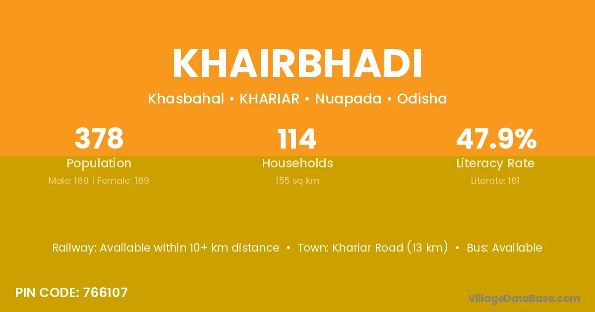 Khariar Road (13 km) is the nearest town to Khairbhadi village for major economic activities and is located approximately 13 km away.