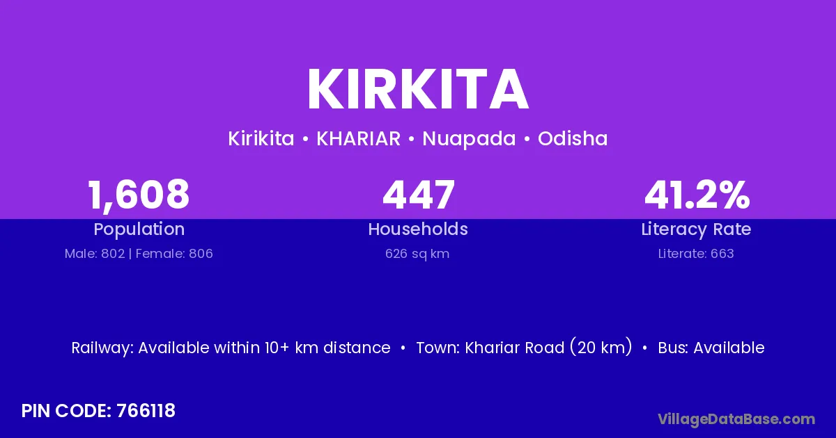 Khariar Road (20 km) is the nearest town to Kirkita village for major economic activities and is located approximately 20 km away.