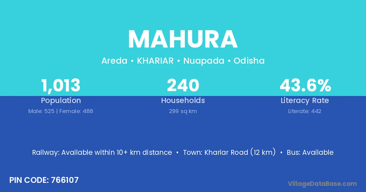 Khariar Road (12 km) is the nearest town to Mahura village for major economic activities and is located approximately 12 km away.