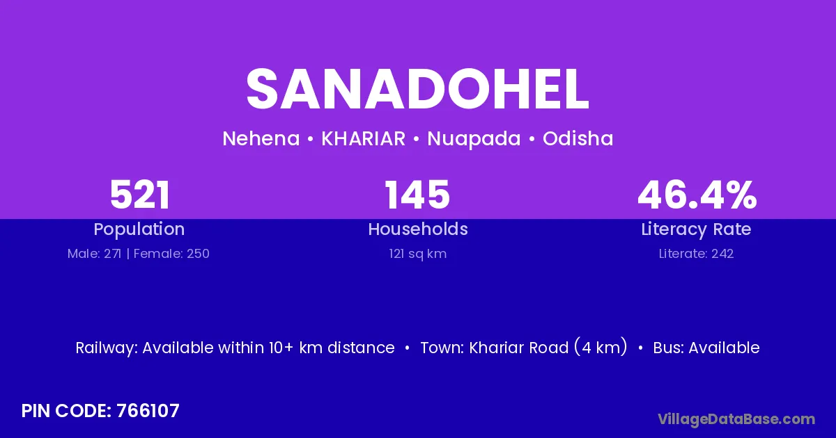 Khariar Road (4 km) is the nearest town to Sanadohel village for major economic activities and is located approximately 4 km away.