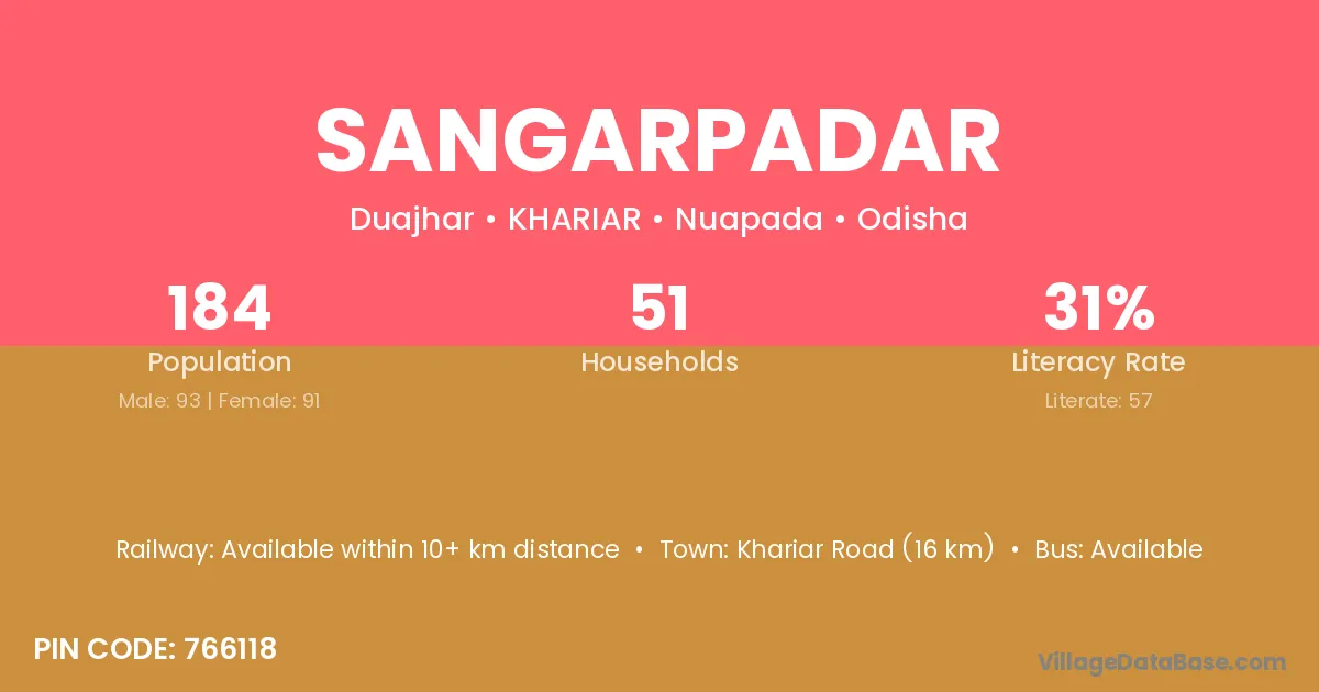 Khariar Road (16 km) is the nearest town to Sangarpadar village for major economic activities and is located approximately 16 km away.