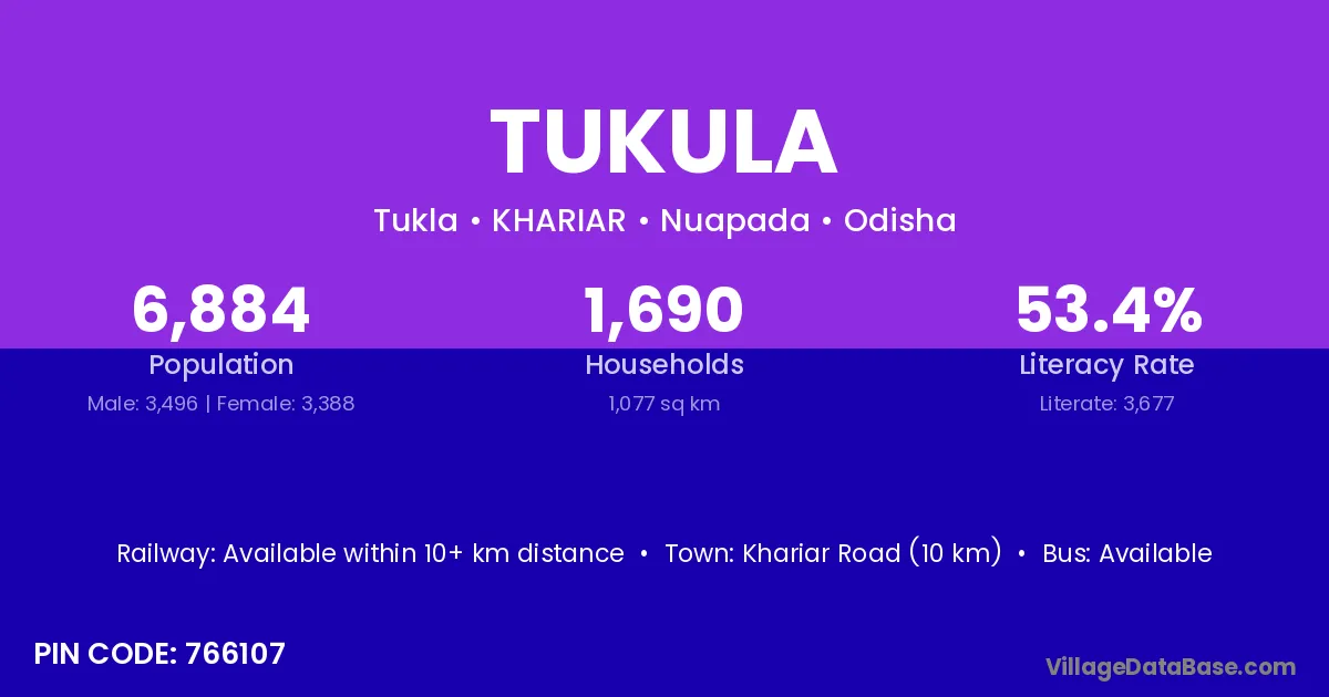 Khariar Road (10 km) is the nearest town to Tukula village for major economic activities and is located approximately 10 km away.