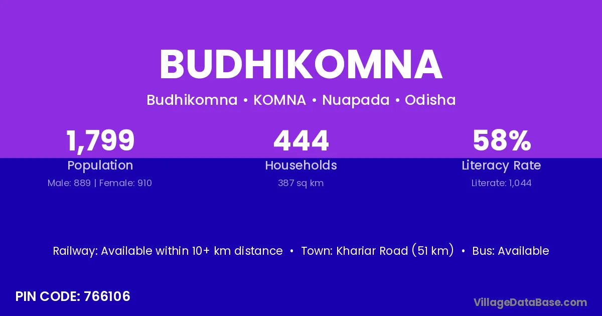 Khariar Road (51 km) is the nearest town to Budhikomna village for major economic activities and is located approximately 51 km away.