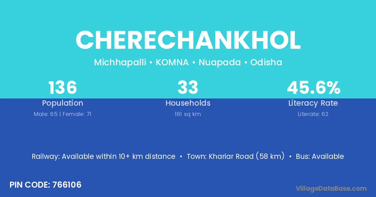 Khariar Road (58 km) is the nearest town to Cherechankhol village for major economic activities and is located approximately 58 km away.