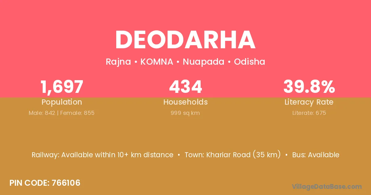 Khariar Road (35 km) is the nearest town to Deodarha village for major economic activities and is located approximately 35 km away.
