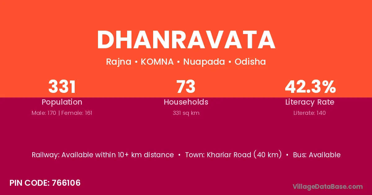 Khariar Road (40 km) is the nearest town to Dhanravata village for major economic activities and is located approximately 40 km away.