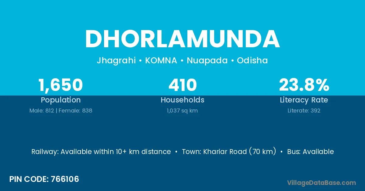 Khariar Road (70 km) is the nearest town to Dhorlamunda village for major economic activities and is located approximately 70 km away.