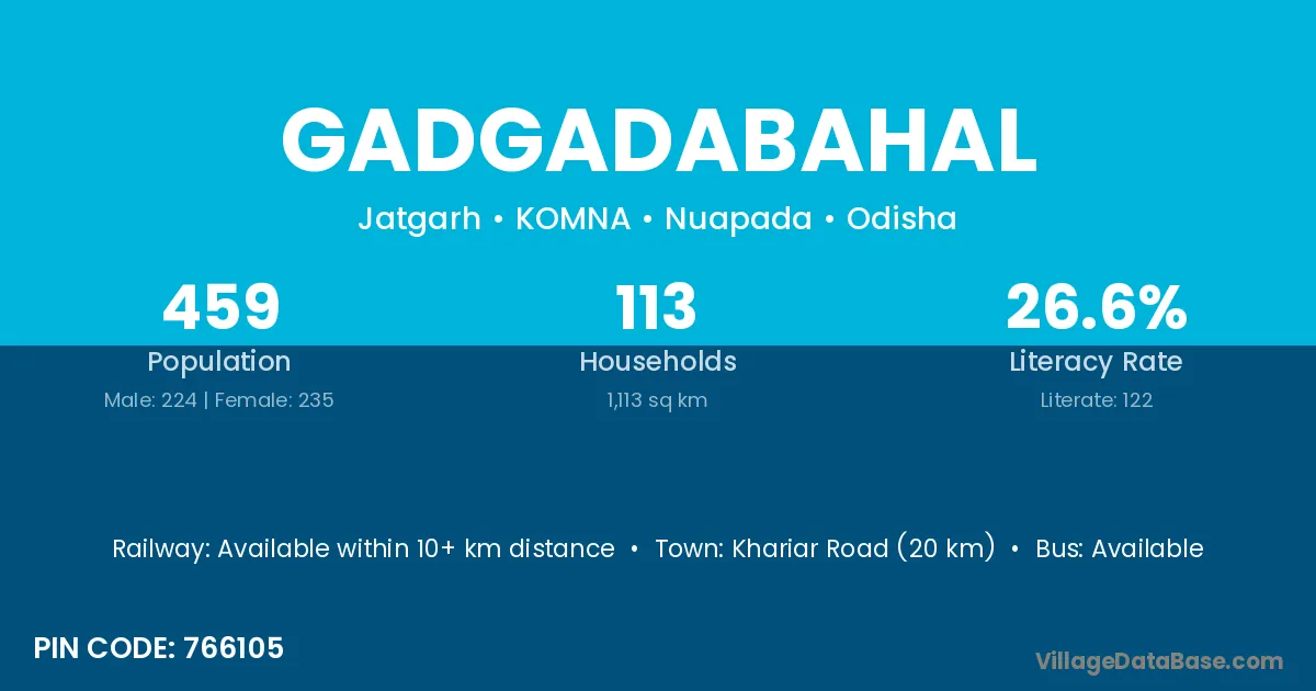 Khariar Road (20 km) is the nearest town to Gadgadabahal village for major economic activities and is located approximately 20 km away.
