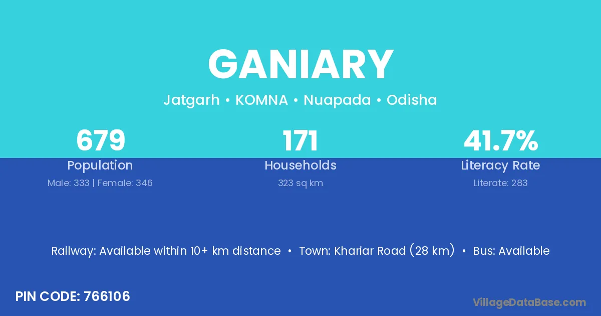 Khariar Road (28 km) is the nearest town to Ganiary village for major economic activities and is located approximately 28 km away.