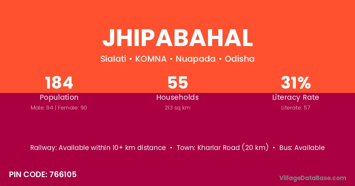 Khariar Road (20 km) is the nearest town to Jhipabahal village for major economic activities and is located approximately 20 km away.