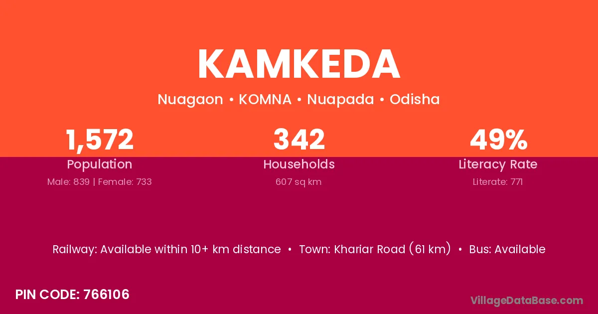 Khariar Road (61 km) is the nearest town to Kamkeda village for major economic activities and is located approximately 61 km away.
