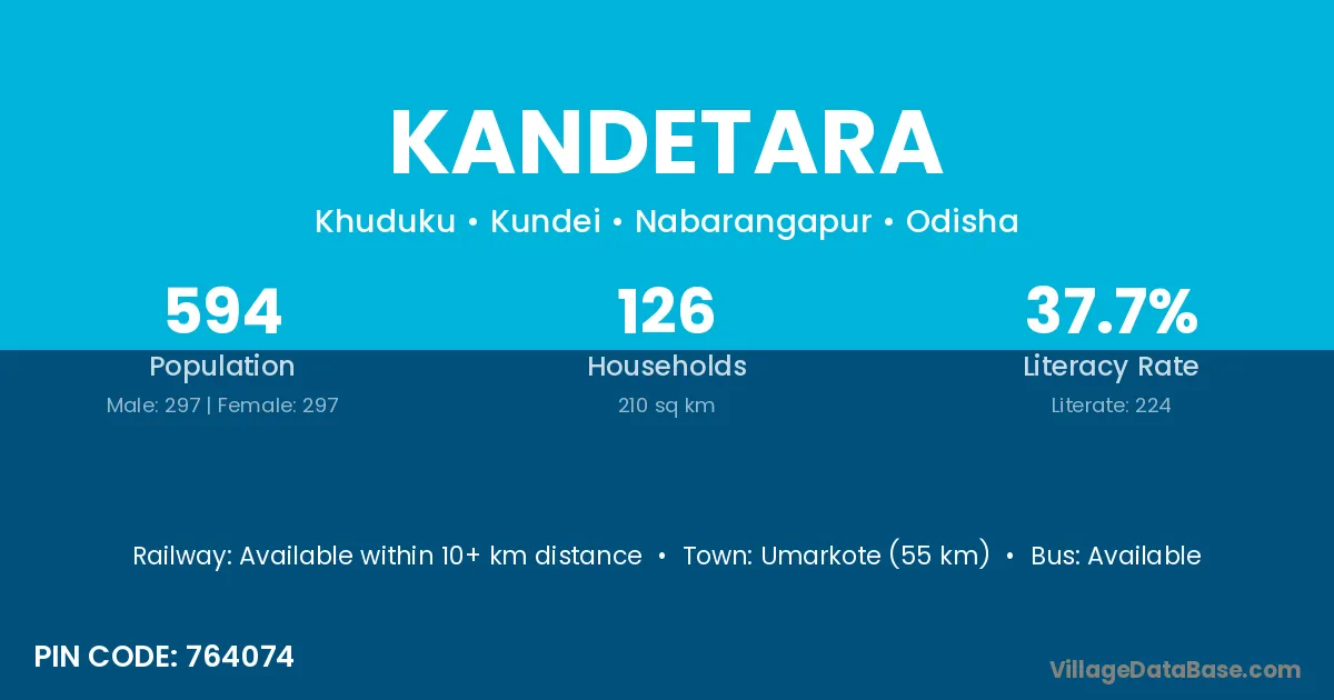 Khariar Road (40 km) is the nearest town to Kandetara village for major economic activities and is located approximately 40 km away.