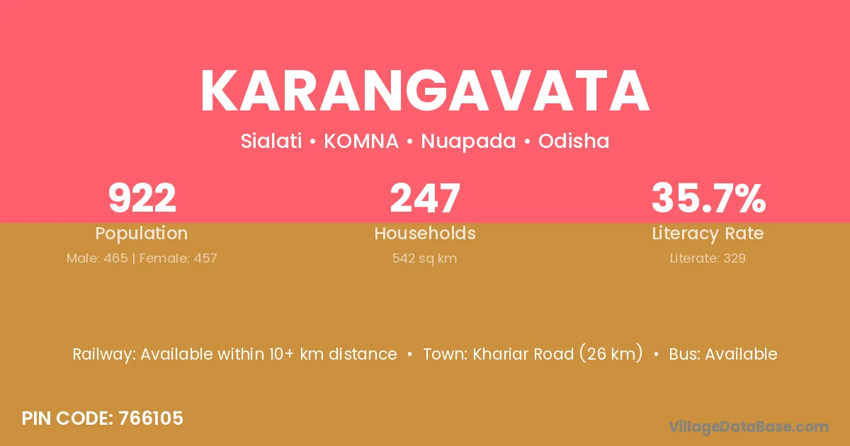 Khariar Road (26 km) is the nearest town to Karangavata village for major economic activities and is located approximately 26 km away.
