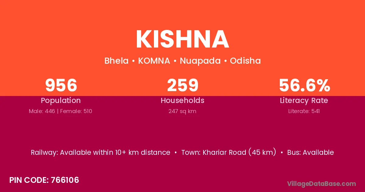 Khariar Road (45 km) is the nearest town to Kishna village for major economic activities and is located approximately 45 km away.