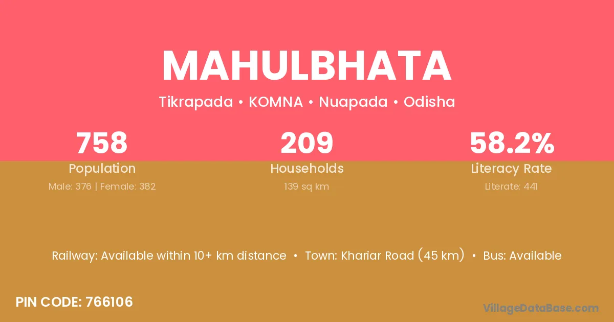 Khariar Road (45 km) is the nearest town to Mahulbhata village for major economic activities and is located approximately 45 km away.