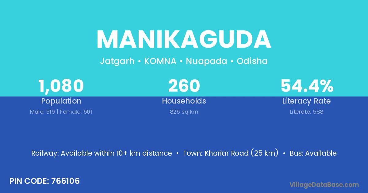 Khariar Road (25 km) is the nearest town to Manikaguda village for major economic activities and is located approximately 25 km away.
