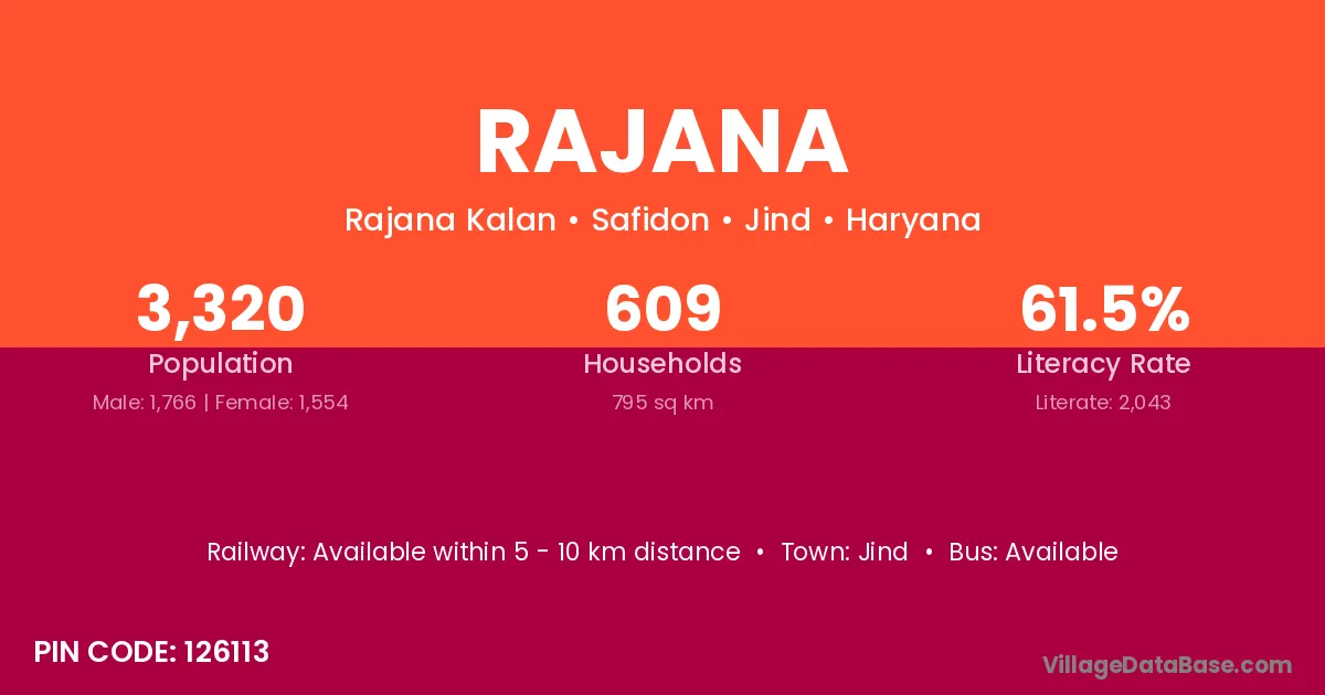 Rajana village has a total population of 1,248 people, of which 624 are males and 624 are females.
