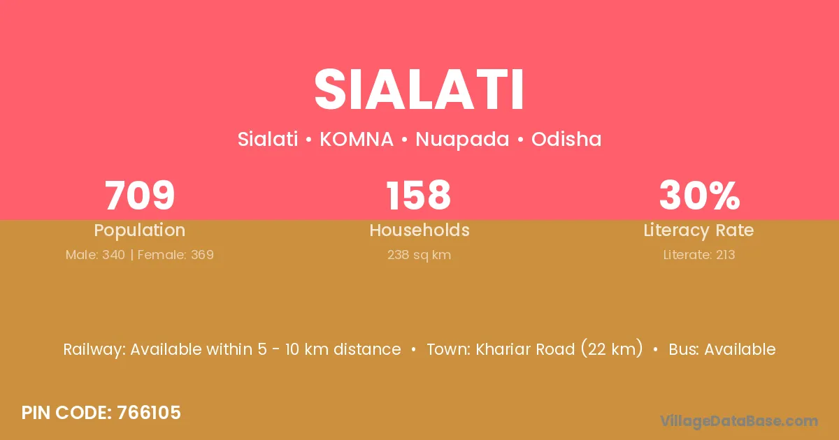 Khariar Road (22 km) is the nearest town to Sialati village for major economic activities and is located approximately 22 km away.