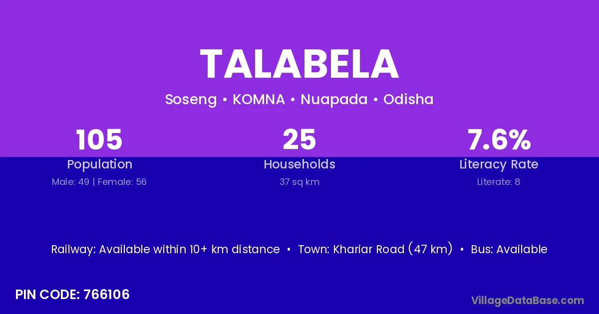 Khariar Road (47 km) is the nearest town to Talabela village for major economic activities and is located approximately 47 km away.