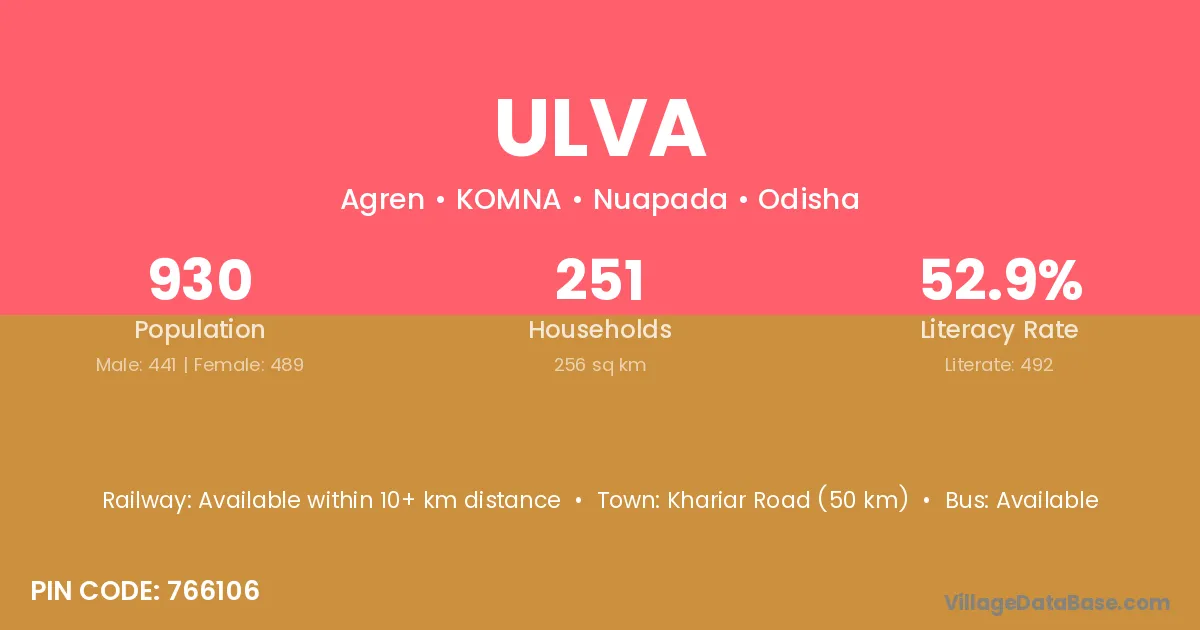 Khariar Road (50 km) is the nearest town to Ulva village for major economic activities and is located approximately 50 km away.
