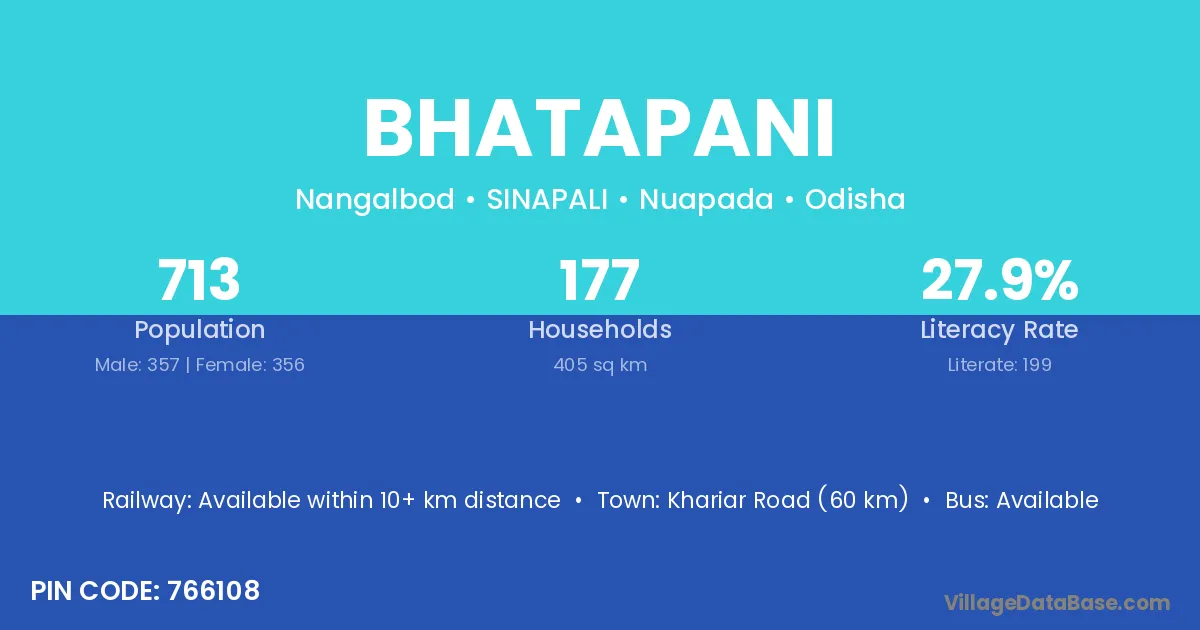 Bhatapani village has a total population of 713 people, of which 357 are males and 356 are females.