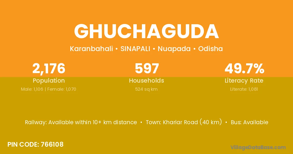 Khariar Road (40 km) is the nearest town to Ghuchaguda village for major economic activities and is located approximately 40 km away.