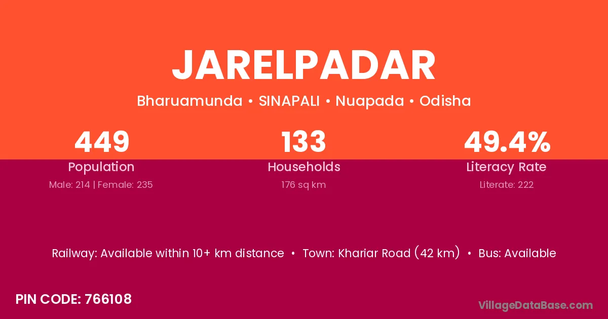 Khariar Road (42 km) is the nearest town to Jarelpadar village for major economic activities and is located approximately 42 km away.