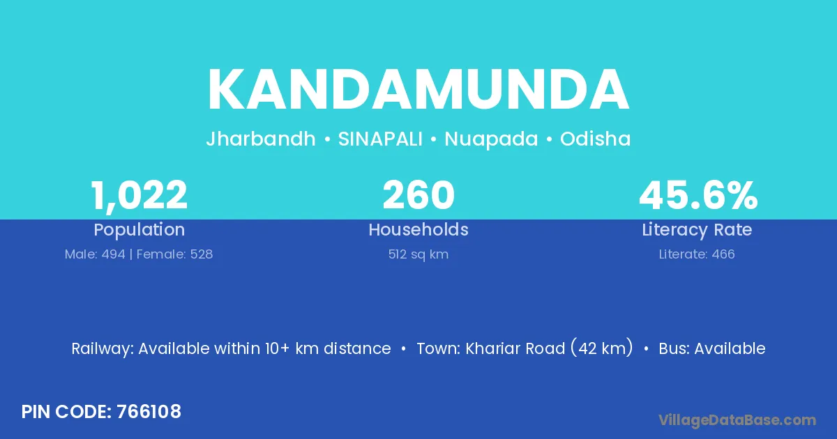 Khariar Road (42 km) is the nearest town to Kandamunda village for major economic activities and is located approximately 42 km away.