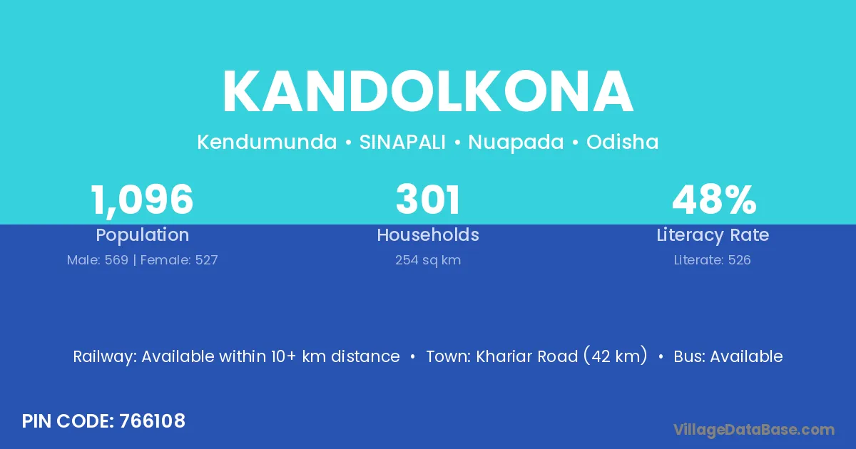 Khariar Road (42 km) is the nearest town to Kandolkona village for major economic activities and is located approximately 42 km away.