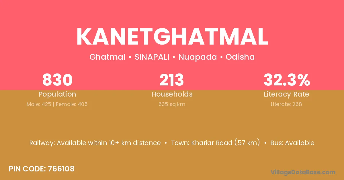 Khariar Road (57 km) is the nearest town to Kanetghatmal village for major economic activities and is located approximately 57 km away.