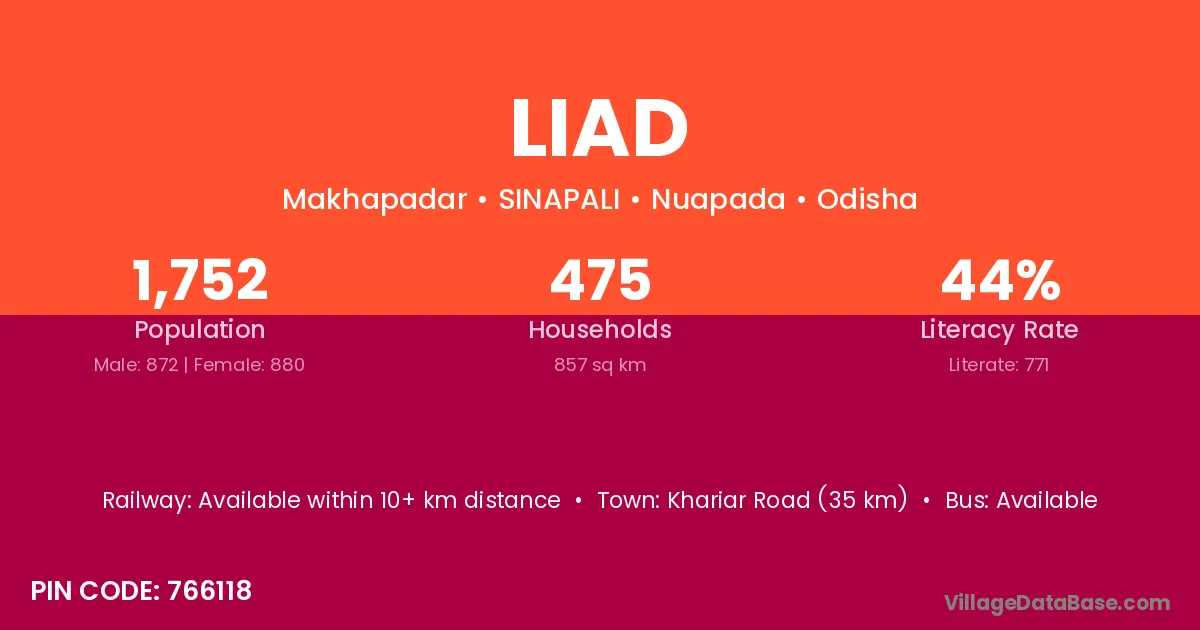 Khariar Road (35 km) is the nearest town to Liad village for major economic activities and is located approximately 35 km away.