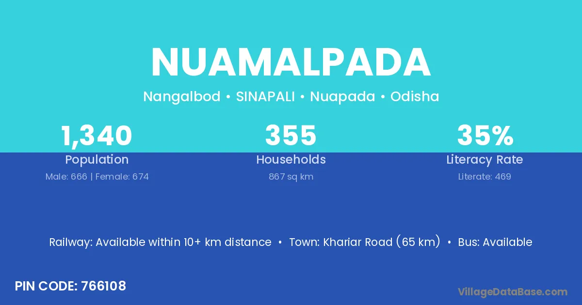 Khariar Road (65 km) is the nearest town to Nuamalpada village for major economic activities and is located approximately 65 km away.