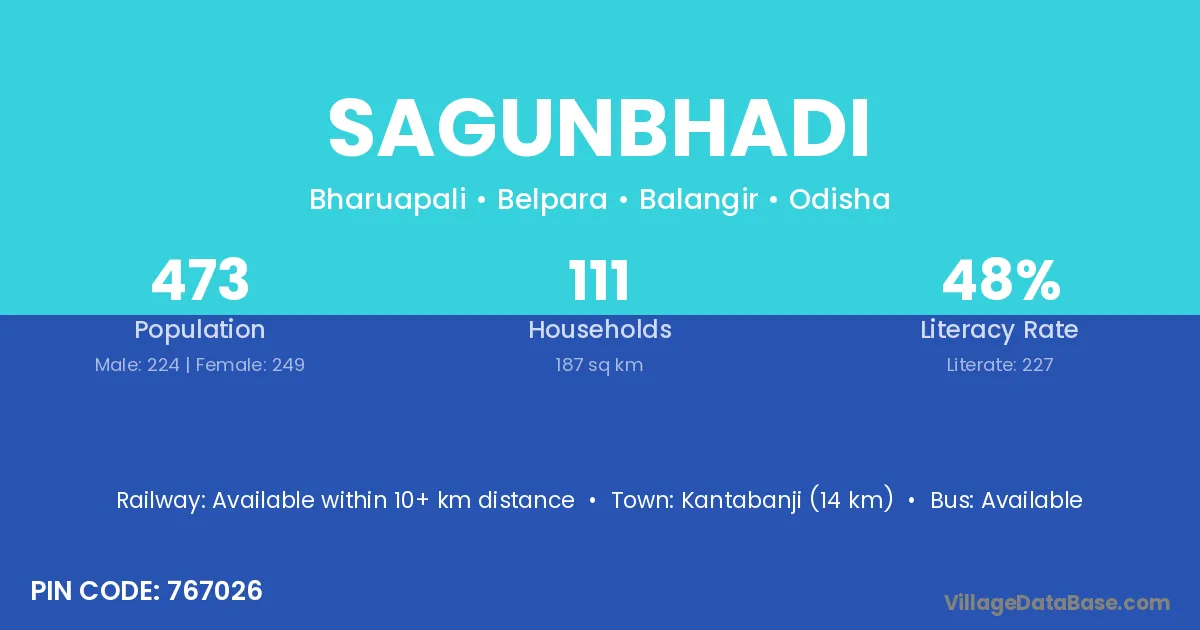 Khariar Road (32 km) is the nearest town to Sagunbhadi village for major economic activities and is located approximately 32 km away.
