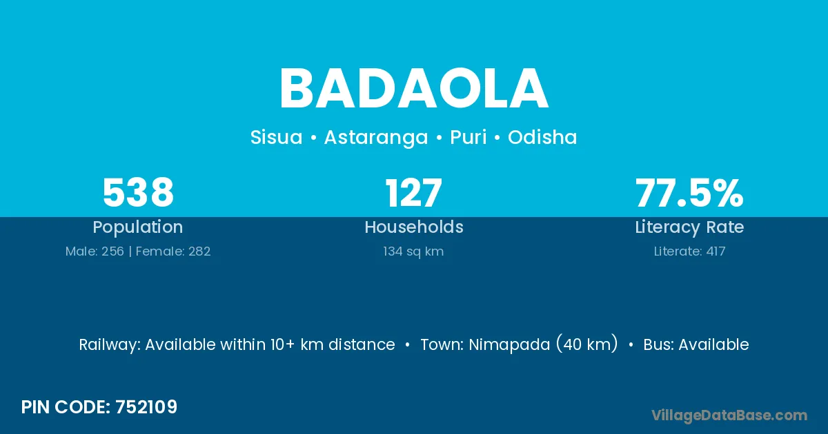 Nimapada (40 km) is the nearest town to Badaola village for major economic activities and is located approximately 40 km away.