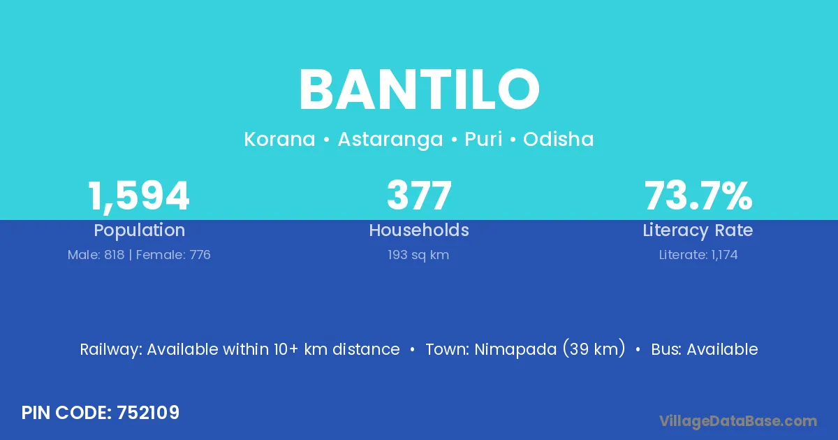 Nimapada (39 km) is the nearest town to Bantilo village for major economic activities and is located approximately 39 km away.