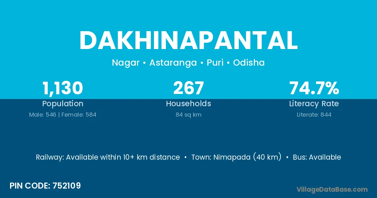 Nimapada (40 km) is the nearest town to Dakhinapantal village for major economic activities and is located approximately 40 km away.