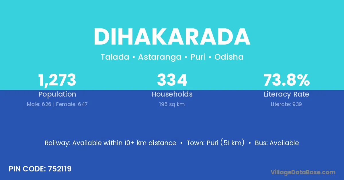 Puri (51 km) is the nearest town to Dihakarada village for major economic activities and is located approximately 51 km away.