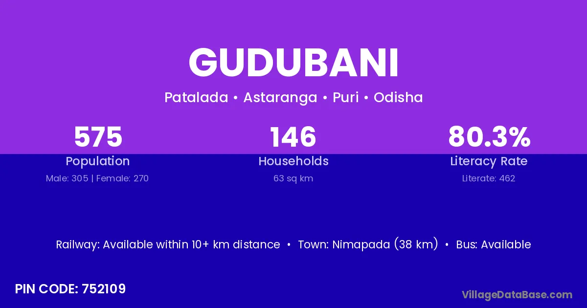 Nimapada (38 km) is the nearest town to Gudubani village for major economic activities and is located approximately 38 km away.