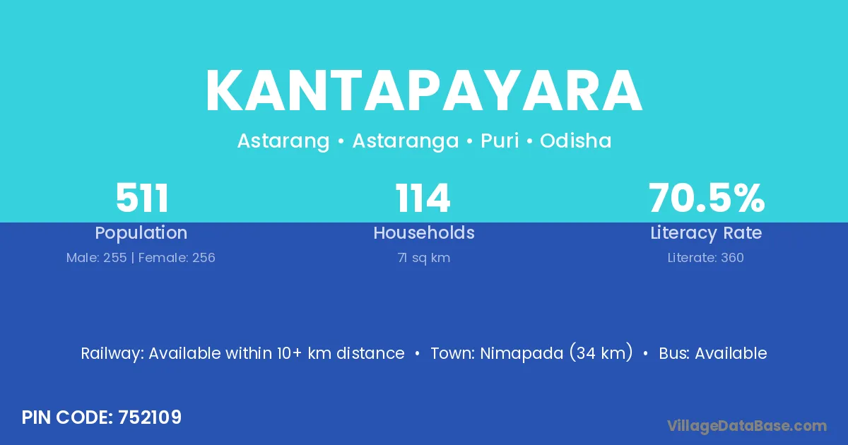 Kantapayara village has a total population of 511 people, of which 255 are males and 256 are females.