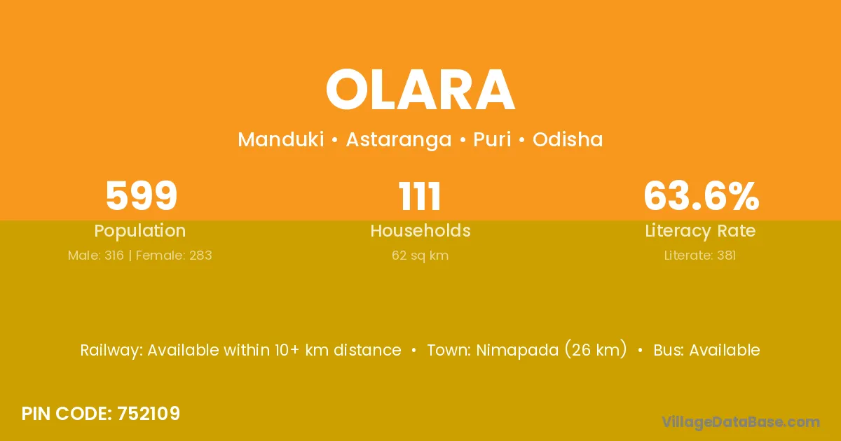 Nimapada (26 km) is the nearest town to Olara village for major economic activities and is located approximately 26 km away.