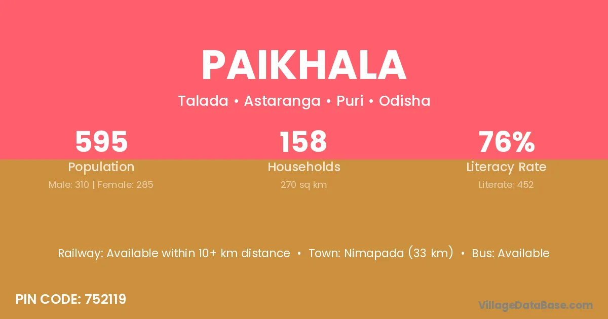 Paikhala village has a total population of 595 people, of which 310 are males and 285 are females.