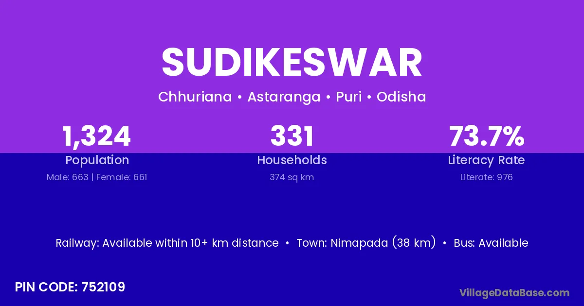 Sudikeswar village has a total population of 1,324 people, of which 663 are males and 661 are females.